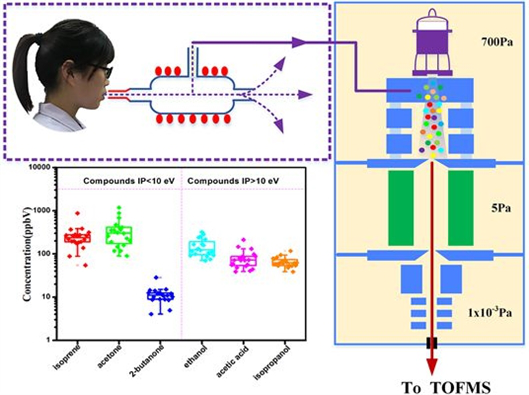 李海洋团队利用高气压下的真空紫外灯(VUV)光电离结合飞行时间质谱技术(HPPI-TOFMS)分析人体呼出气,在1分钟的采样时间内实现了对人体呼出气中丙酮、异戊二烯、二甲基硫、乙醇、乙酸等物质的高灵敏检测。在100%相对湿度条件下,该方法能够实现浓度低至几十pptV挥发性有机物(VOCs)的直接在线检测,且对苯系物、呋喃类、含硫和含氮化合物具有超高的灵敏度和选择性,这在污染暴露分析、职业病防治等领域具有重要的应用前景。相对于其它呼出气检测方法,该技术的最大优势在于受湿度干扰小,特别是针对相对湿度高达100%的呼出气检测这一大难点,成功消除了各种除湿方法不可避免会造成衡量待测物损失的不足。