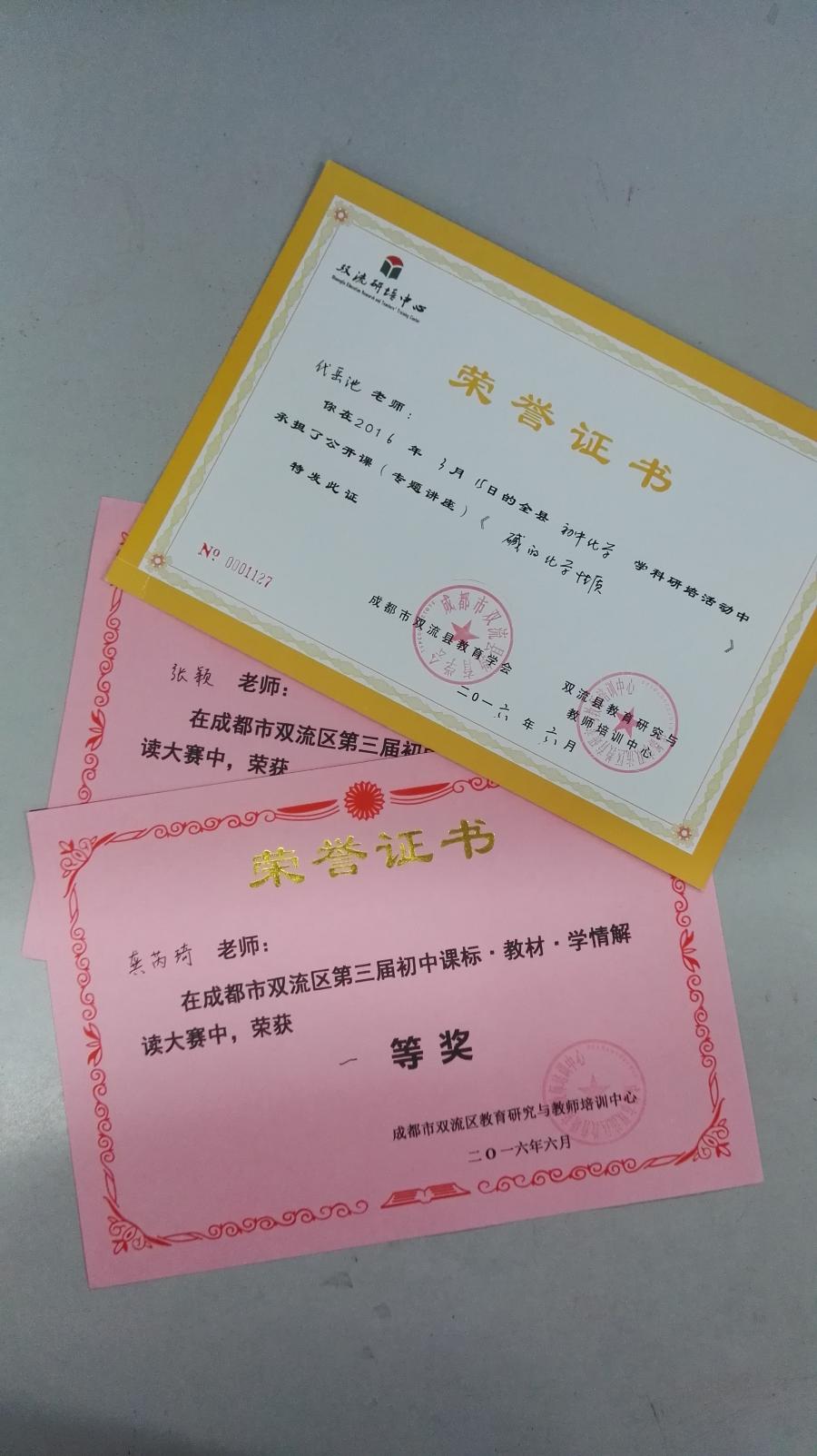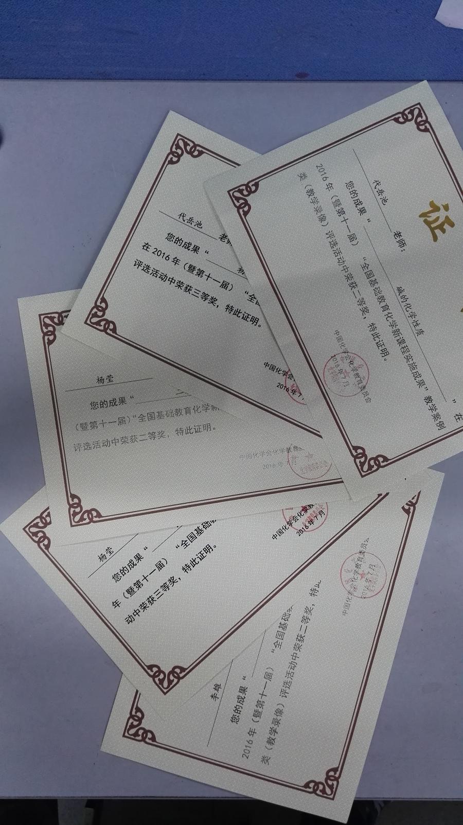 在2015至2016学年,化学组全体教师团结合作,共同上进,参加国家,省市和县级举办的多次比赛,获得可喜可贺的优异成绩。希望全体化学教师能戒骄戒躁,不忘初心,继续向前,为教育事业不断奉献自己的热情和智慧。