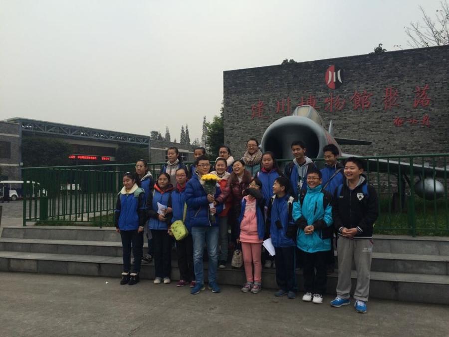 9点30分师生一行到达大邑县安仁镇建川博物馆,前往壮士群雕广场,同学们手持鲜花,庄严地向死难者和英雄致敬。
