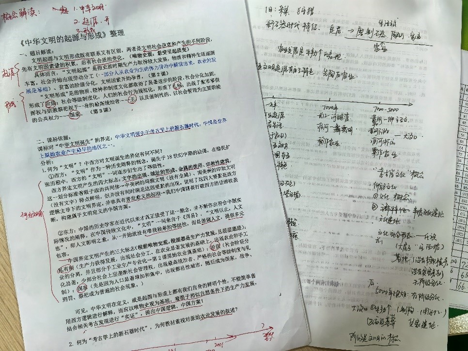 在抽到“中华文明的起源与形成”这个选题后,晋云萍老师组织大家对这个题目进行解读和研讨,并从核心素养整体视角出发,结合新课标对新旧教材的变化进行解读,精准把握各教学环节之间的内在联系与逻辑顺序。胡敏霞老师提出以“科学求真、文化寻根”为主题进行单元整体设计。黄雯老师发挥自身考古学背景优势收集教学资源并做了充分的学情调查。李然老师以我校学科特色活动课为蓝本,修改完善了本单元的教学设计。