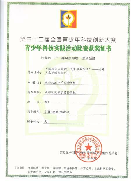 第32届全国青少年科技创新大赛在浙江杭州举行。在本届大赛上,我校的参赛项目在与众多强手的竞争中,最终脱颖而出,由向敏、姚萌、张淼玲三位老师指导的科技实践活动《探知风云变幻,气象服务生活——校园气象观测与探究》获得全国一等奖,并且荣获全国十佳优秀科技实践活动奖。