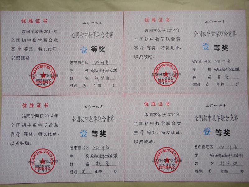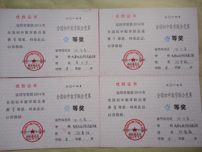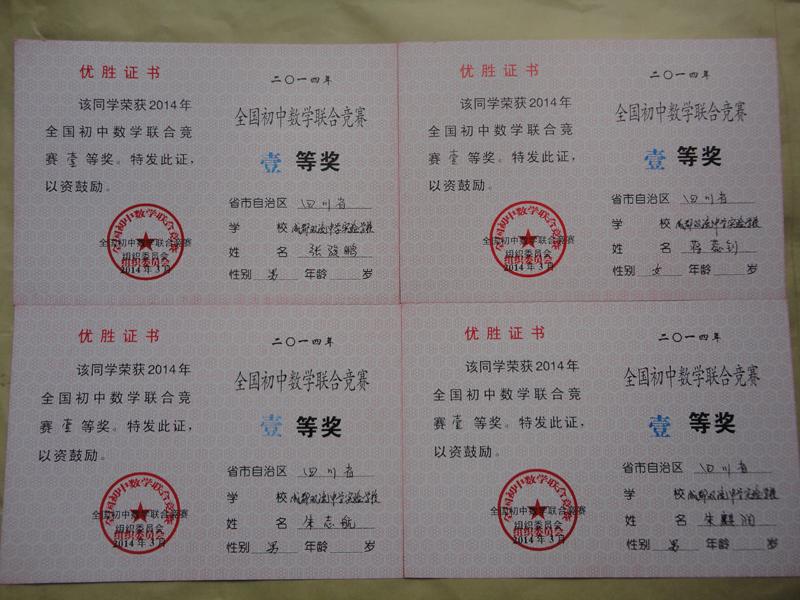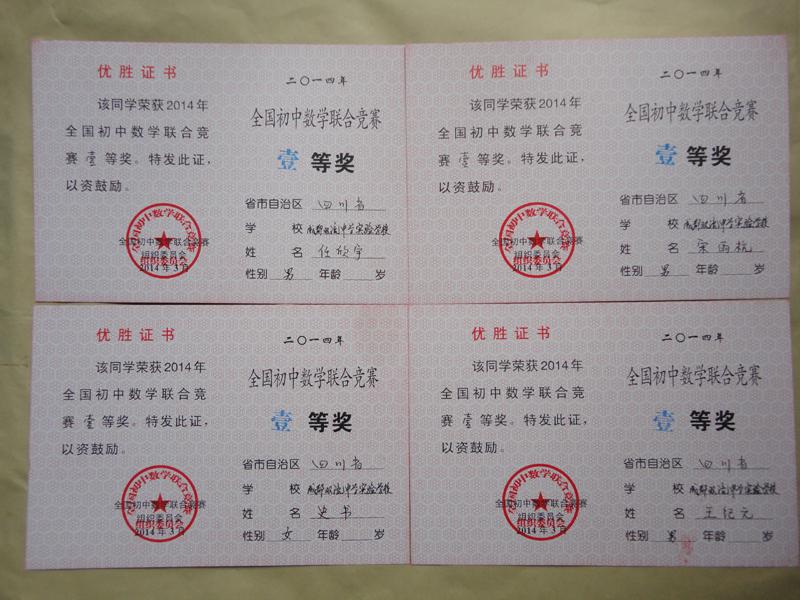 2014全国初中数学联赛我校一等奖获得者证书展示