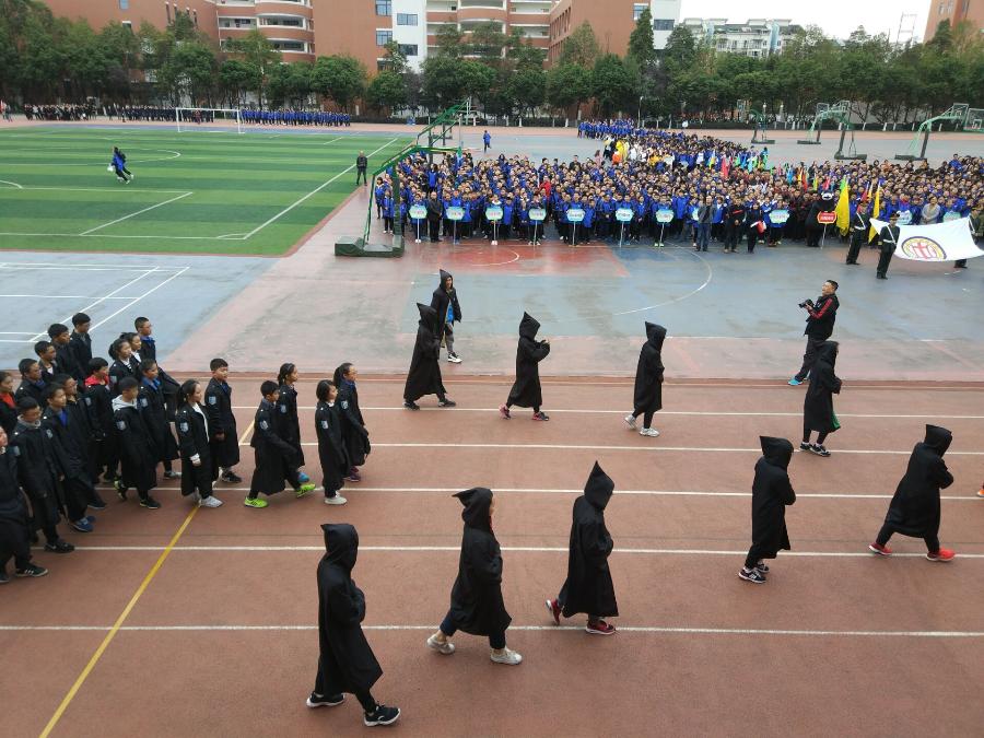 开幕式在欢乐祥和的音乐声中拉开帷幕。护旗手高举国旗、校徽先经过主席台,然后是七、八年级共43个班级穿着整齐的服装,高喊着”班级口号”,迈着整齐的步伐、昂首挺胸的经过主席台,接受领导检阅。有许多班级还排练了整齐的节日,展示出了各班班级风采.