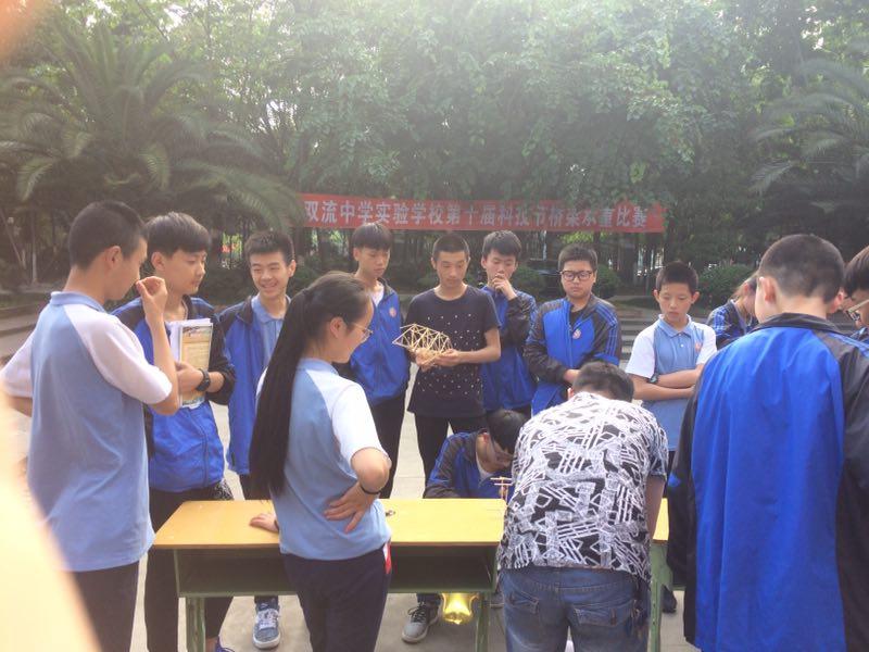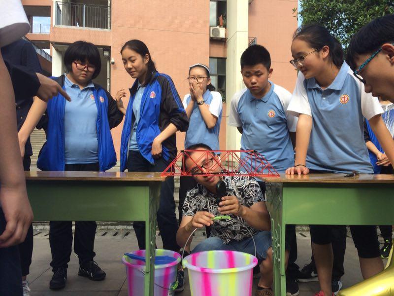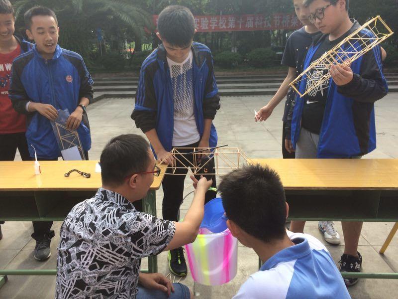 2017年6月1日,我校第十届科技节创意大赛——桥梁承中比赛在英语角进行。比赛中,同学们积极发挥自己的创意,用一根根小木棍制作设计出了各式各样的桥梁模型,有梁式桥、拱式桥、悬索桥、斜拉桥、刚构桥和组合体系桥。本次活动丰富了同学们的课余生活,也培养了同学们的创造性。