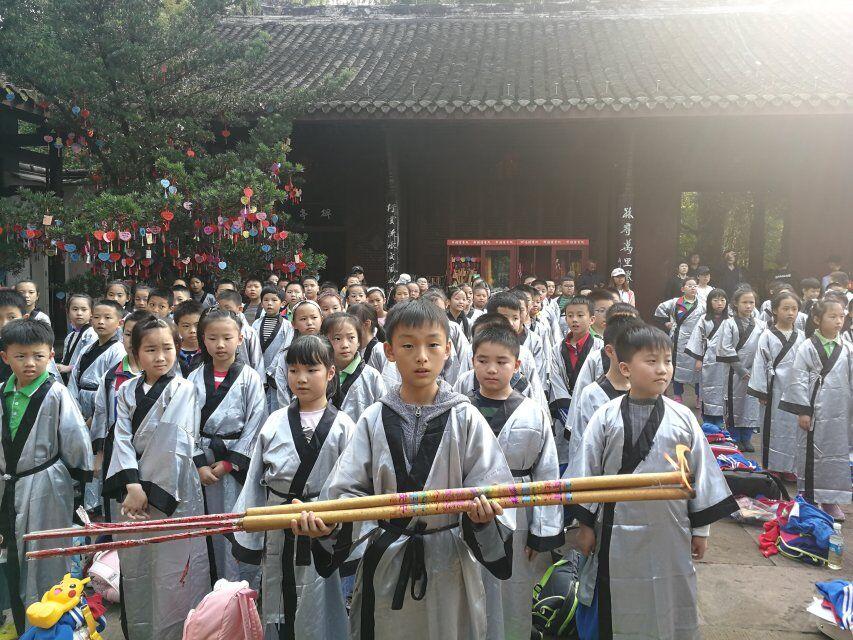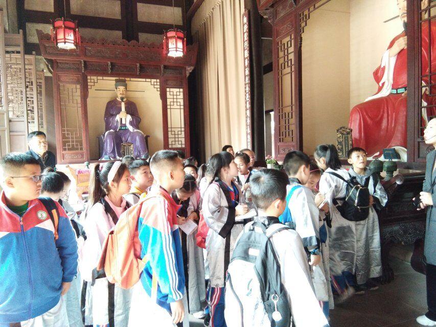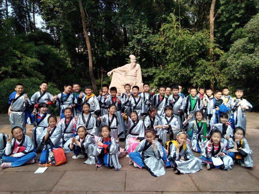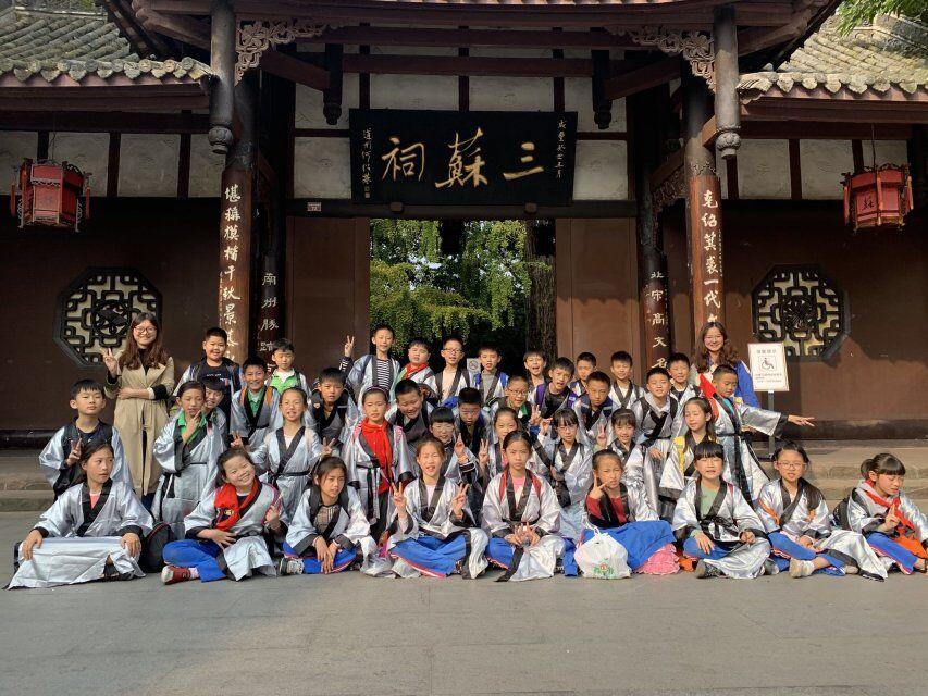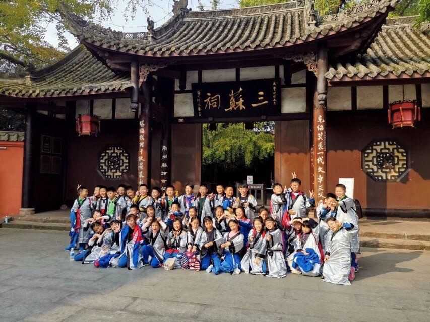 行至正殿外,孩子们身着国学服,和老师们一起吟诵经典。一曲《水调歌头》,让我们的思念穿越古今;一首《定风波》,把我们豪情定格在眉州。一场简单而祭拜,让我们在实践中知、行、研、悟。
