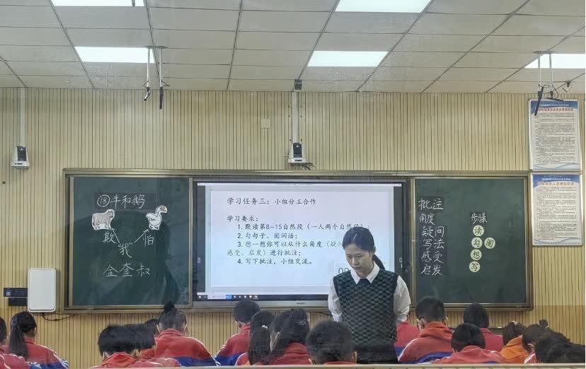 简洁明了的开课,让同学们在回顾文章整体的基础上迅速进入课堂状态。跟着王老师走进文章内容的脚步,学生们也逐渐揭开了阅读方法——批注的面纱。