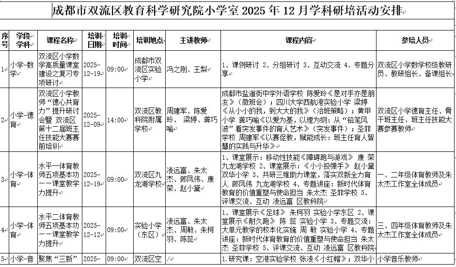 成都市双流区教育科学研究院小学室2025年12月学科研培活动安排