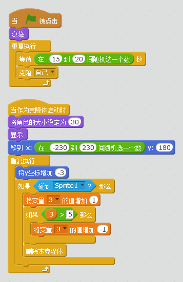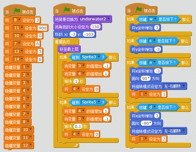 这是我本学期参加Scratch选修课后,自己设计制作的第一个游戏,请大家多多指教!以下为部分游戏角色代码: