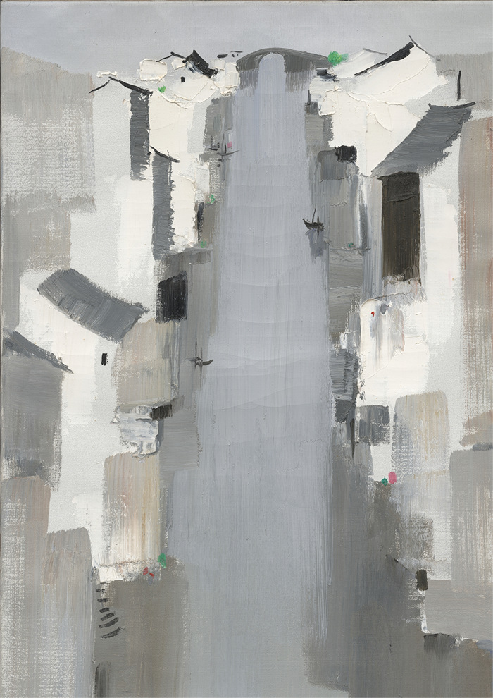 以吴冠中绘画作品里的江南水乡为例,画家通过西方油画技法来表现中国传统艺术的黑白水墨,以独特视角勾勒出江南水乡的温婉风情。画面上,小桥流水人家,白墙黑瓦的经典元素跃然纸上,辅以勃勃生机的绿意盎然,构建出一幅充满诗情画意的全景画卷。大面积的白墙黑瓦在氤氲的江南水汽中格外醒目,仿佛一抹亮色,瞬间点亮观者的眼眸。屋顶的灰与河道的灰相互映衬,无形中使画面空间显得既深远又开阔,营造出一种超脱尘世的宁静与和谐。色彩运用上,该作品虽采用鲜艳的色彩与鲜明的笔触,但整体色调却异常柔和,这种巧妙的色彩搭配不仅保留了江南水乡的温婉细腻,也赋予了画面西方油画的空间立体感。如此,既展现了中国绘画中独有的意境之美,又融合了西方油画的视觉震撼,形成了独树一帜的艺术风貌。
