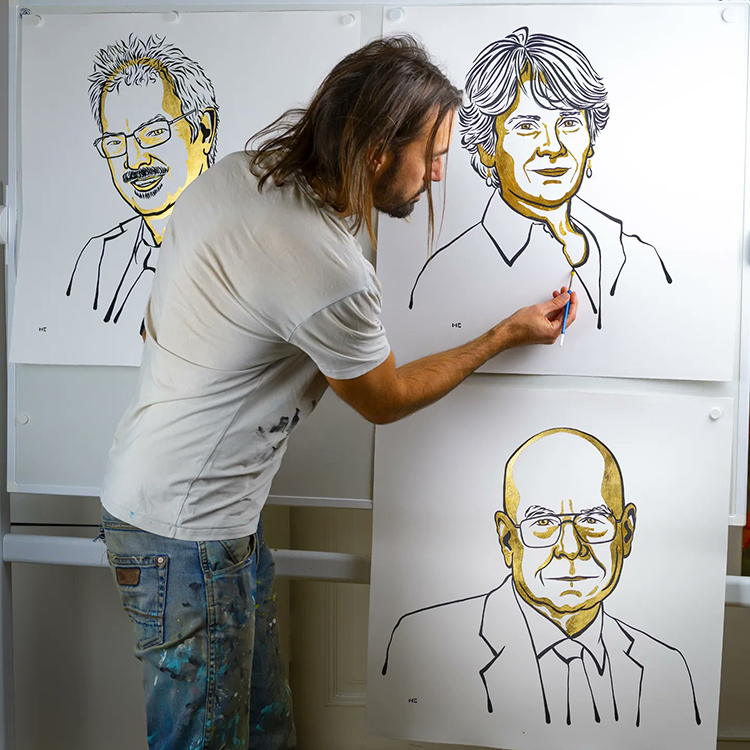 而在2017年时,诺贝尔奖委员会决定以金色呈现获奖者名字,于是尼克拉斯从2018年开始将金色元素融入到肖像画中。画像上的金色部分使用的并不是普通的金色颜料,而是一种可以用特殊胶水涂在画上的超薄金属箔。这种独特的绘制技巧,使得白色背景上的金色部分与黑色轮廓相映成趣,为画像增添了别样的魅力。