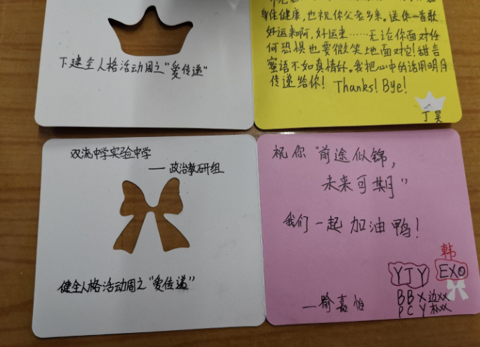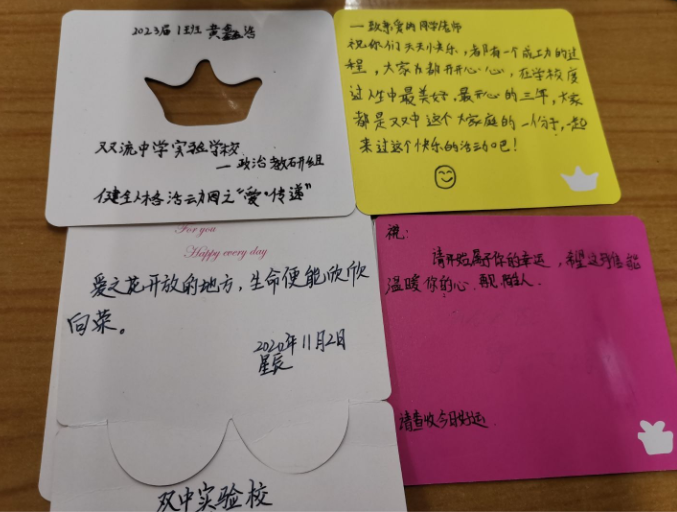 今天双流中学实验学校政治组组织的健全人格活动周开展了“爱传递”活动。