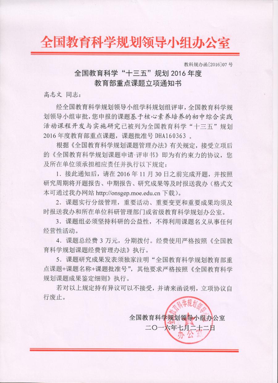 我校综合实践活动课题被立项为教育部重点课题
