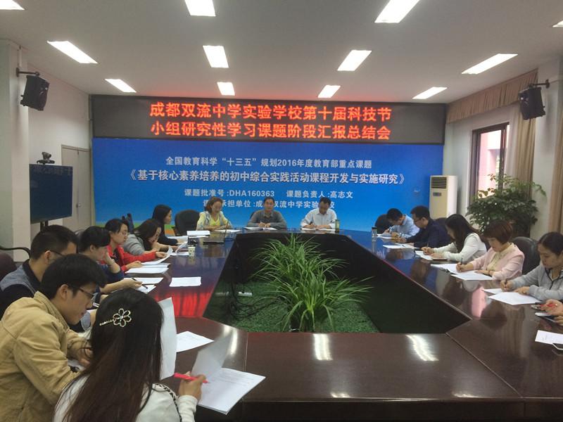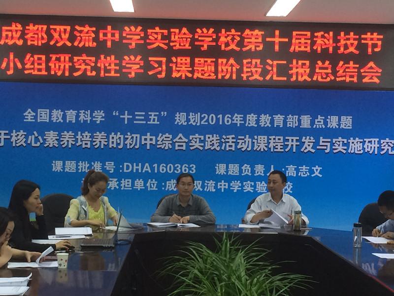 2017年5月14日,双流中学实验学校第十届科技节——小组研究性学习课题阶段汇报交流总结会在学校三会议室隆重召开。出席会议有:学校教科室主任文传福、教务处主任罗晓章、小组研究性学习课题组全体成员以及参与本次课题汇报的指导教师。本次会议的主要内容有:1.课题组组长李春燕老师介绍本次会议的目的和意义;2.部分指导老师作经验分享;3.课题组对本次课题汇报作总结交流;4、王宗渠老师公布本次初赛结果;5、罗晓章主任对课题组工作作指导。
