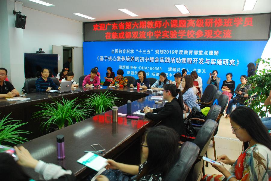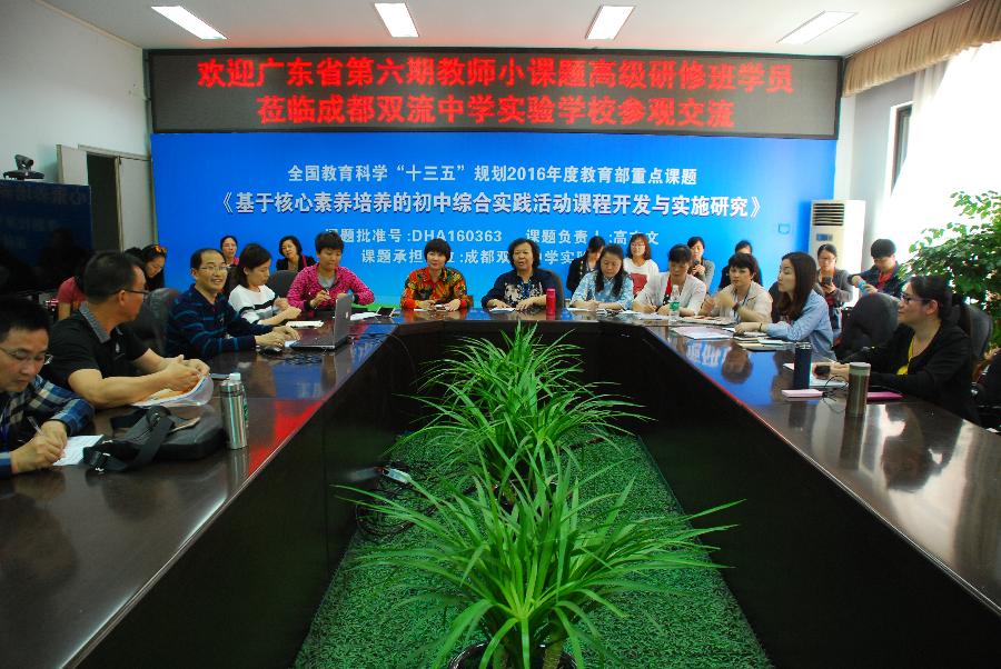 2017年5月11日,广东省教师继续教育学会举办的广东省第六期教育科研课题研究高级研修班学员(分管教育科研的校长或教科室主任)50余人到我校考察学习交流,双流区研培中心理论室易恩主任主持会议。