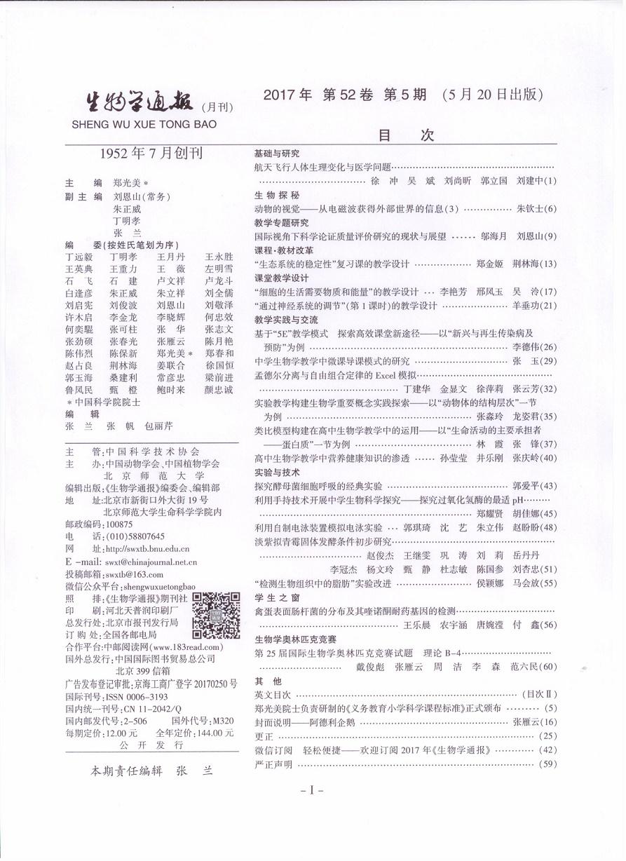 热烈祝贺我校张淼玲、龙姿君两位老师的论文《实验教学构建生物学重要概念实践探索——以“动物体的结构层次”一节为例》,在《生物学通报》2017年第5期教学实践与交流栏目发表。《生物学通报》是由中国科学技术协会主管,中国动物学会、中国植物学会和北京师范大学主办的全国生物学类核心期刊。