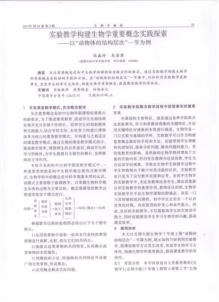 该文章的写作源于2016年9月,我组张淼玲老师参加了四川省初中生物优质课现场赛课活动,执教的《动物体的结构层次》一课荣获大赛一等奖。赛后,张老师积极地进行总结反思,思考重要概念的构建中实验教学的作用。最终,结合我校自主开发的课堂教学模式中的——初中生物概念探究式教学模式,总结出实验教学是概念课教学流程中获取事实的一个重要方法,并以执教的“动物体的结构层次”为例,展示在课堂教学中,如何巧妙利用实验教学,使课堂教学方式发生改变,凸显学生的学习主体性,提高课堂教学的有效性,构建生物学科重要概念。