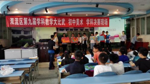 双流区2017年美术教师学科大比武于2017年5月26日在棠湖中学举行,,我校美术教师程剑在组长吴永建老师和古英详老师陪同下代表我校参赛。“双流区第九届美术学科大比武”现场赛课,赛制为课前一小时抽题-现场备课-借班上课-评委提问答辩。按照抽签顺序,我校程剑老师作为第二位参赛选手上场,所抽课题为《旅行团的旗帜与标志》,以“小组讨论、代表发言、自主探究学习、分组合作实践、小游戏”形式激发学生兴趣,将课堂教学模式灵活运用,设计理念出新出彩,展示了我校艺术学科教师深厚的基本功及课堂调控能力,获得评委与同行的称赞。(美术组)