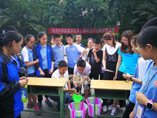七八年级各班的同学事先团结合作,利用给定的器材制作了木质桥梁,很多都富有创意,设计新颖,造型各异,有拱桥、梯形桥、三角形桥……各具特色,不一而足,充分体现了同学们的巧手匠心。