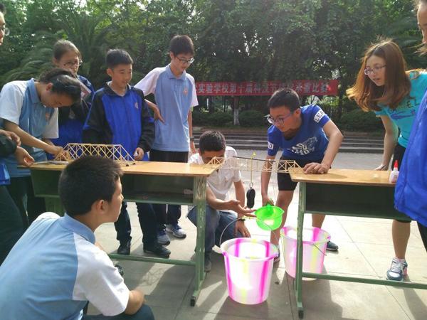 2017年6月1日下午,英语角异常热闹,第十届科技节创意比赛之桥梁承重比赛正在这里精彩上演。