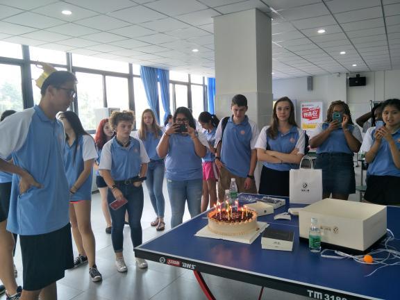 快乐的时光让学生们流连忘返,依依不舍地离开熊猫基地后,还有另外的惊喜等待着他们。7月7日这天是Benjamin罗杰明的18岁生日,学校老师在他完全不知情的情况下,为他在学校准备了一个surprise birthday party,大家为他齐唱生日歌,送上了最美好的祝福!(陈幸)