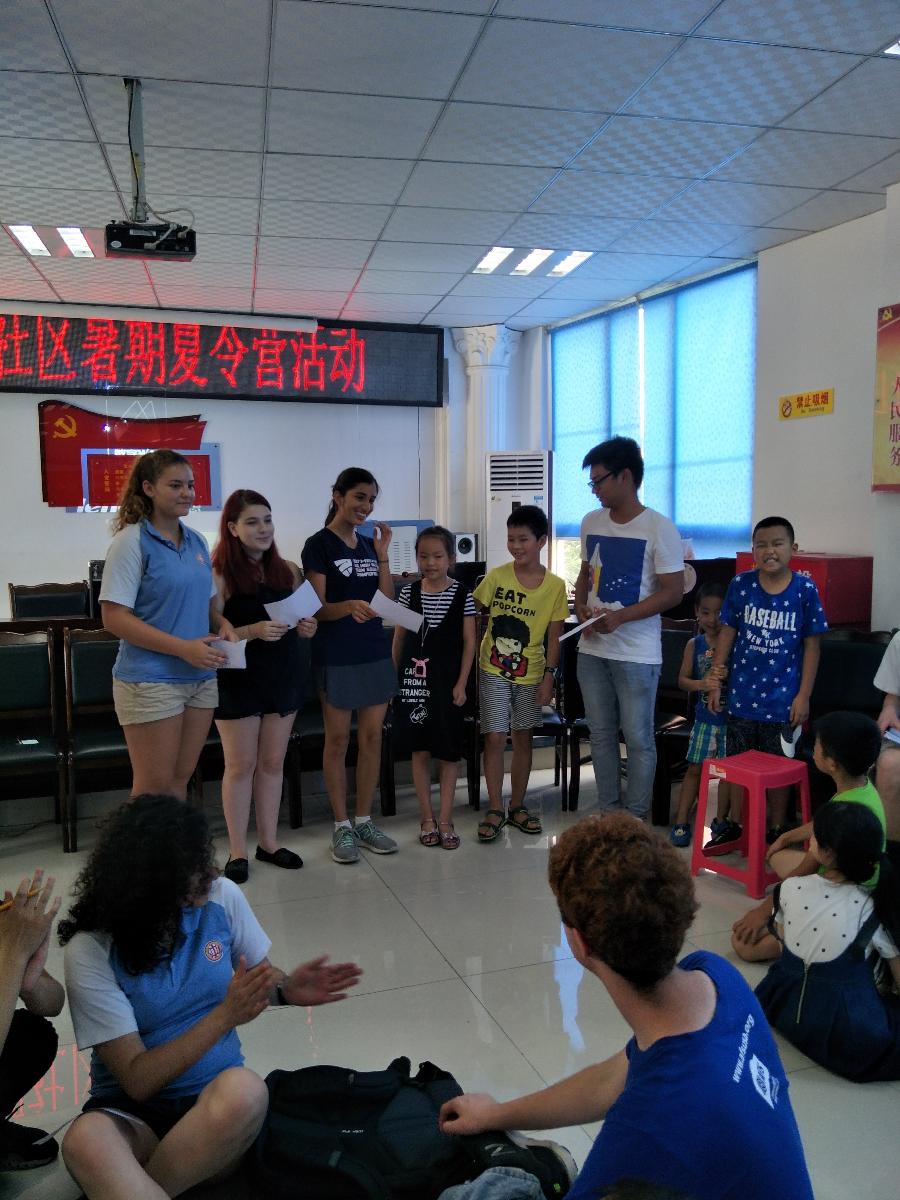 在当地社工的带领下,美国学生首先参观了社区农民的新居所,看到了中国新农村的新风貌。随后来到社区服务中心参加活动,由楠柳社区党委书记对美国学生的到来致欢迎辞后,美国学生与当地参加暑期夏令营的小朋友展开了互动活动。活动内容十分丰富,有教读古诗词、打太极、写书法等。中国小朋友用10分钟时间教会美国学生念《忆江南》等几首古诗,小朋友们很聪明,标拼音、教字形,很是认真。美国中学生也不得了,学了10分钟后展示的朗诵有模有样。接着角色换位,中国教练教太极一遍,美国学生将所学太极教给刚才的古诗小老师,认真劲儿十足。最后中美孩子一起跟着中国教师学书法。活动中,我校老师们与南柳社工一起积极投入,发挥着重要的组织与指导作用。