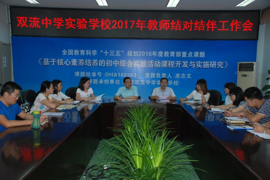 2017年9月6日下午,双流中学实验学校教科室组织召开新教师“结对结伴”工作会议,学校常务副校长张润林、教科室主任文传福、初中部各学科新进教师和他们的指导教师参加会议。
