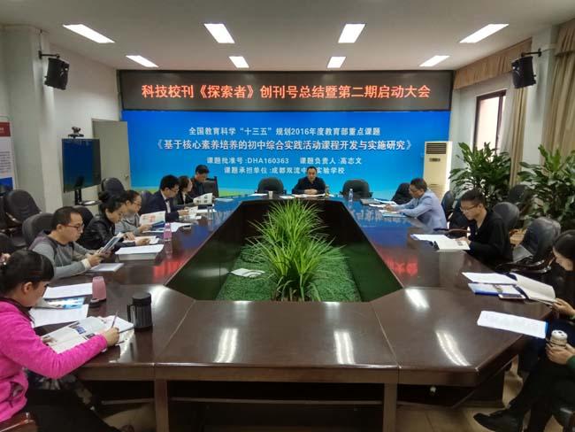 2017年10月19日,在学校三会议室召开了科技校刊《探索者》创刊号总结暨第二期启动会,罗主任和张校长亲临指导。首先由主编段绪德老师用“地位高、时间长、困难多、人心齐、见成效”这几个关键词对首期《探索者》进行了小结,并对《探索者》发放规则、成果认定进行了说明,也提出了愿景规划。其次,段老师对二期《探索者》进行了工作安排,也对各栏目给出了建议。接着,罗主任对封面的排版设计提出了中肯的意见,也建议在内容中设置二维码,提高《探索者》的可视性。他强调一定要把好质量关,栏目设置可继续探讨并整合,审稿和投稿一定要到位。最后,张校长提出《探索者》要起到课程引领作用,通过发放方式多样化来提高期刊的影响力,还应增加学生作品,探索整合的可能性。