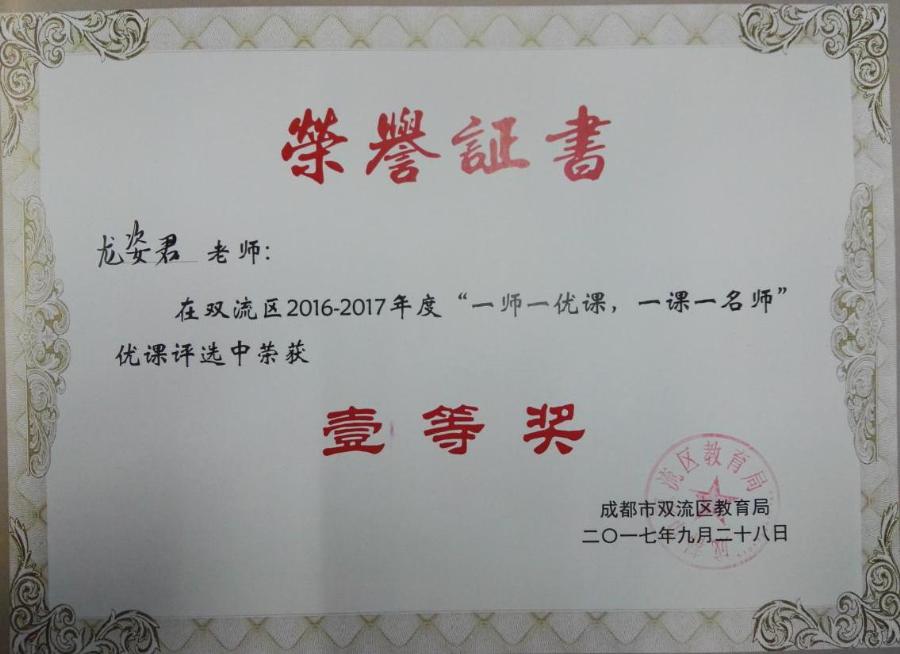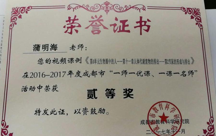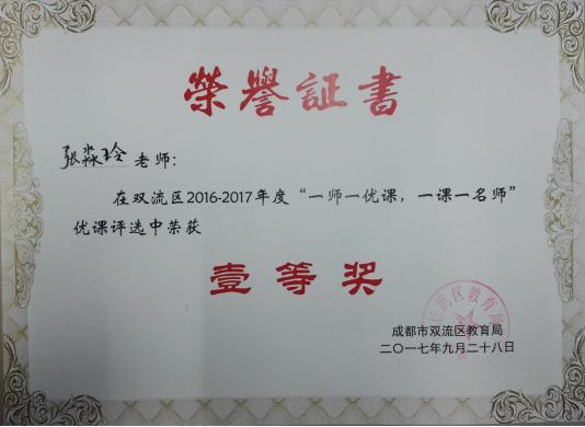 在2016—2017年度成都市“一师一优课、一课一名师”和双流区“一师一优课、一课一名师”优课评选活动中,我校生物组共有6人次获奖,同时这也刷新了我校整个教研组在教育主管部门组织的赛课活动中的获奖比例。生物教研组现共有7名专职生物教师,本次优课评选获奖的老师分别是:龙姿君、蒲明海、张淼玲和雷智。其中龙姿君老师荣获成都市一等奖、双流区一等奖;蒲明海荣获成都市二等奖、双流区一等奖;张淼玲荣获双流区一等奖;雷智荣获双流区二等奖。(生物组)