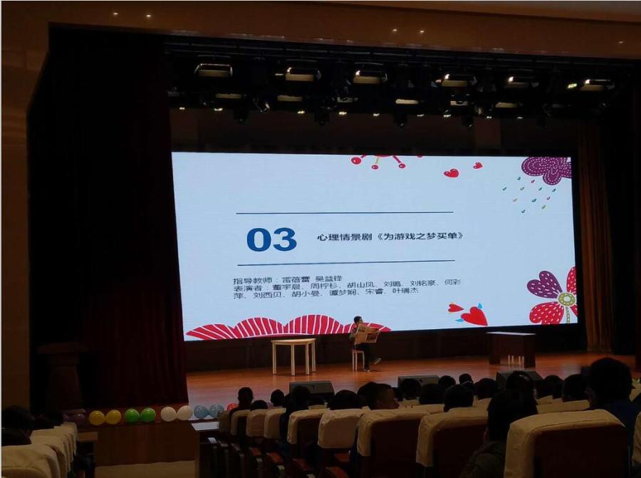 第一个表演的剧目是心理剧《为游戏之梦买单》,本剧分四幕。讲诉了初中生阳阳沉迷网游“王者荣耀”,学习一落千丈。父母、老师、同学劝他,他还不以为然,甚至决定把游戏作为终身职业,但其实他对游戏并不擅长,只是把玩游戏当成逃避学习压力的借口。后来在心理老师的帮助下,心理课上同学们对他进行劝谏、生涯幻游活动,学校的模拟招聘会活动也让他意识到应该对自己的未来进行重新定位,成绩也得到了提升。