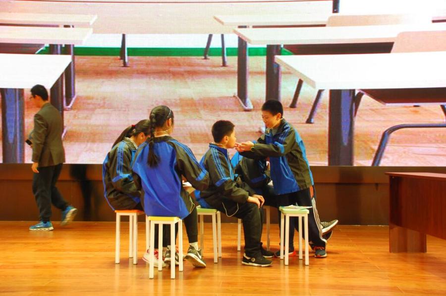 为了给观众呈现一场精彩的表演。小演员们在学习之余,利用中午、下午和周末的休息时间进行排练。往往是一幕的演员在排练时,其他演员还在抓紧时间做作业。