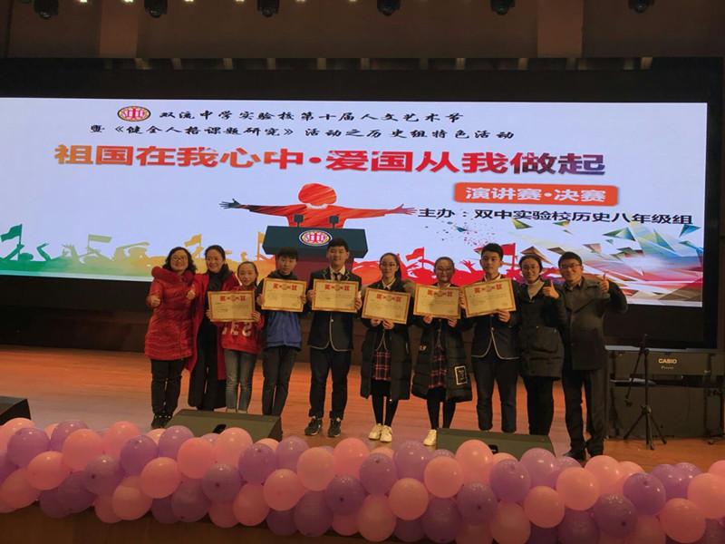 2017年12月3日晚,双中实验校第十届人文艺术节暨“初中生健全人格教育实践”活动之历史组特色活动——“祖国在我心中,爱国从我做起”演讲会决赛在国际部多功能厅隆重举行。八年级十组选手共14名同学经过精心准备,为在座同学、师长奉上演讲饕餮盛宴。十组同学或激情四射或娓娓道来,尽演讲之能事,诉爱国之情怀,展示了与年龄不相符的大气与沉着,不断将听众的情绪带向高潮。