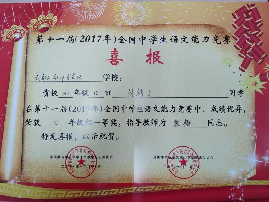 在2017年全国中学生语文能力竞赛中,双流中学实验学校学生喜获佳绩:15人获得全国一等奖,49人获得全国二等奖,85人获得全国三等奖,338人获得省级奖。在此,向获奖同学表示热烈祝贺!(语文组 田海明)