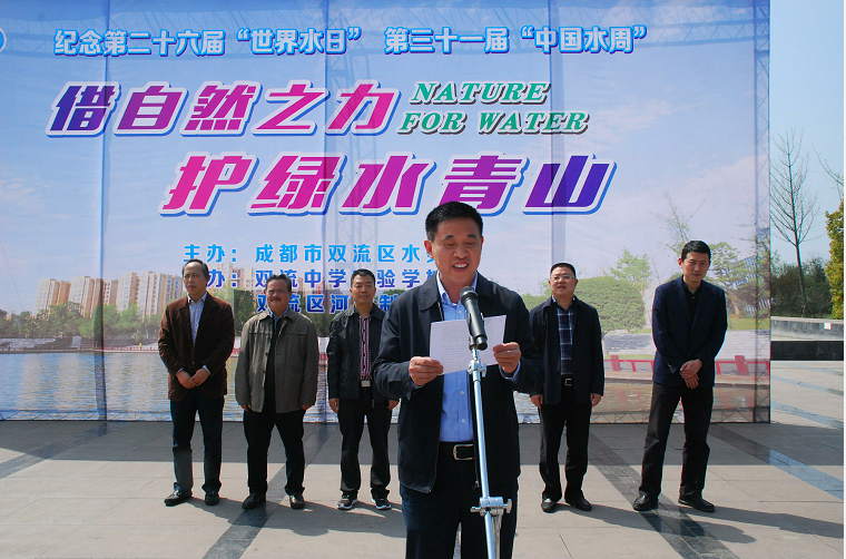 随后,双流中学实验学校校长高志文在讲话中简要总结了学校在保护水资源、保护母亲河方面所做的工作及学校课程改革方面的工作,并表态“将继续让全校师生争做枝头闹春的红杏,引来百花争春,人人成为保护水资源的宣传员,节约用水的先行者,为子孙后代留下碧波万顷,留住绿水青山。”