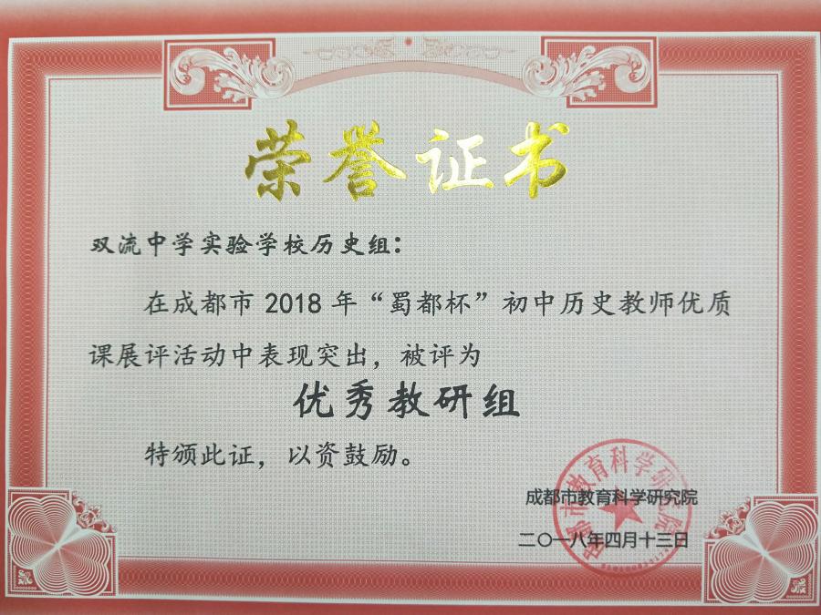 “蜀都杯”是成都历史教研的传统赛事,是成都市历史教师展示教学水平的最高平台,自举办以来培养出大量的名师,涌现出许多优秀的课例,是许多历史教师梦寐以求的舞台。为取得本次活动的承办权,历史组在前期做了大量的铺垫工作。主动与区、市教研员沟通,表达对承办“蜀都杯”强烈愿望;利用教研员开会间隙,带领其参观学校,展示我校良好的校园环境和基础设施,并大力介绍我校课题研究的成果。由于我校硬件“硬”,软件“强”,市教研员赖蓉辉老师欣然同意将2018年“蜀都杯”放在我校举行,这是双流区近20年来首次迎来“蜀都杯”。