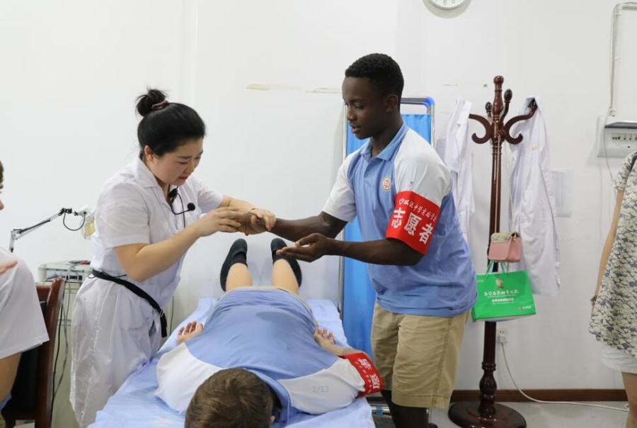到达华孝颐养居后,其经理用英语向美国学生介绍了在此居住的老人情况,以及该敬老院的特点。随后美国学生来到推拿室学习推拿,在此由中医推拿医生讲解中医推拿的相关知识,如中医推拿的历史,推拿的作用等,教会学生认识肩颈背的重要穴位;然后中医推拿医生就推拿做简单讲解、实际操作;最后,学生在理疗推拿医生的指导下,两两学习,互相推拿。