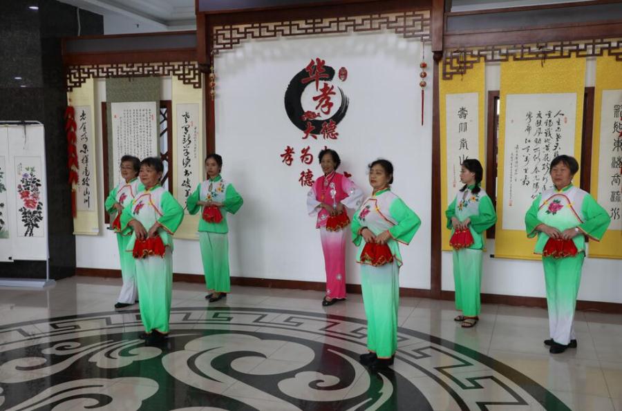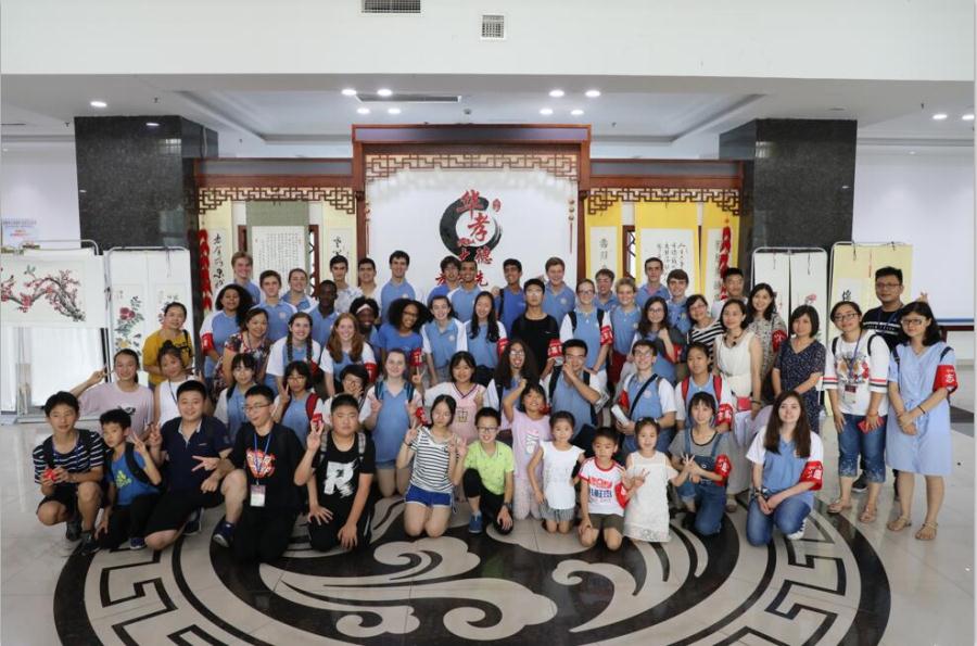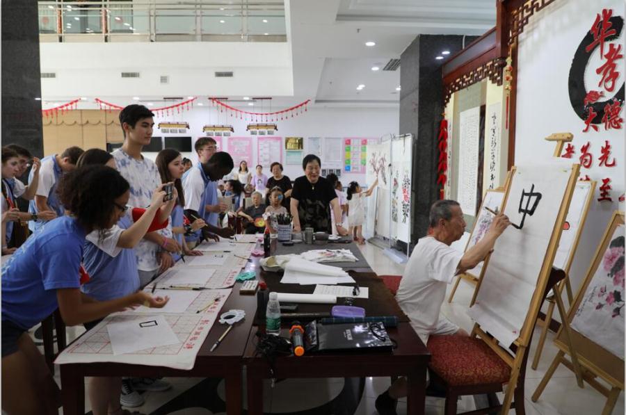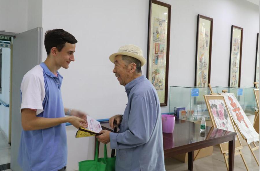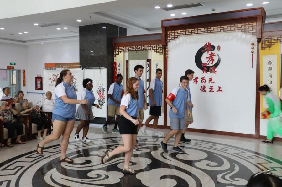 推拿学习结束后,由华孝颐养居的老爷爷和老奶奶展示、介绍他们的书画作品,并教美国学生们简单的书法,如祝福老人的话语(长寿、健康、平安等),以及简单的绘画,如梅、兰、竹、菊等。最后一个环节,三个班的美国学生们分别为老爷爷、老奶奶们送上了自己编排的形式各异的节目,有个性十足的舞蹈,饱含神情的歌曲,还有轻松诙谐的情景表演。美国学生张显个性的表演,犹如炎炎夏日注入的一股清流,给老人们带来了无尽的欢乐与笑语。老人们也不甘落后地献身了他们精心编排的节目,有着中国特色的民族舞,还有高亢的民歌,最后,美国学生们都被一位老人嘹亮的歌声震撼到纷纷起身鼓掌。整个场面热闹而温馨,完全没有异国的违和感。