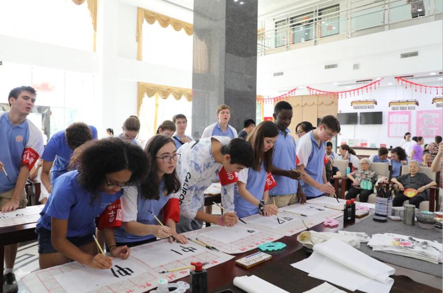 7月18日下午,双流中学实验学校的29名美国学生们,来到双流区华孝颐养居进行社区服务活动。本次社区服务的内容分为三个部分:一、学习中医手部推拿;二、学习有关祝福老人的书法、国画并制作贺卡;三、与老人联欢。