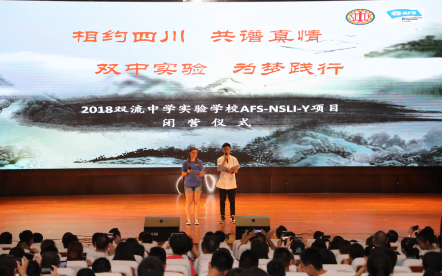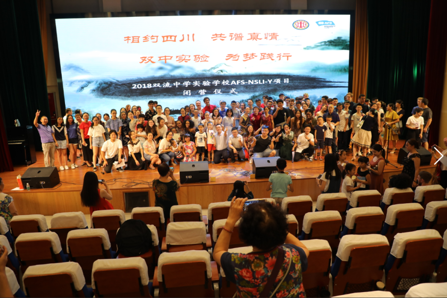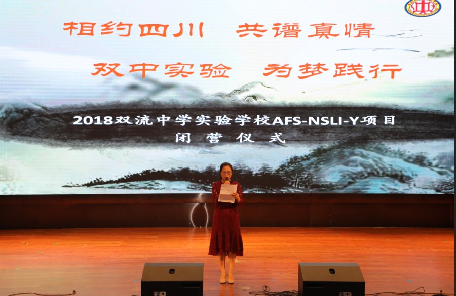 8月9日下午主题为“相约四川、共谱真情、双中实验、为梦践行”的2018双流中学实验学校AFS-NSLI-Y项目闭营仪式在我校国际部多功能厅举行。四川省教育厅国际交流中心项目负责人张展英、双流中学实验学校校长助理罗晓章、双流中学实验学校外事办主任杨红出席了闭营仪式,与29个接待家庭一起见证这29名美国学生的成长。