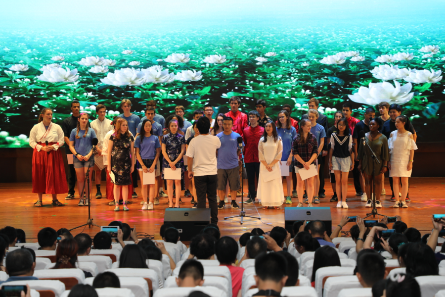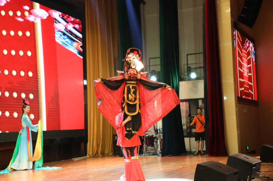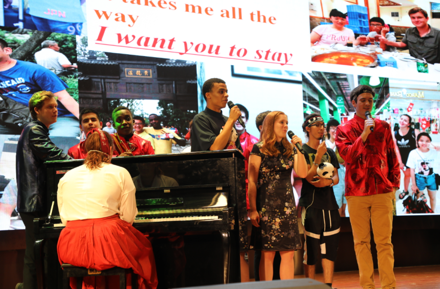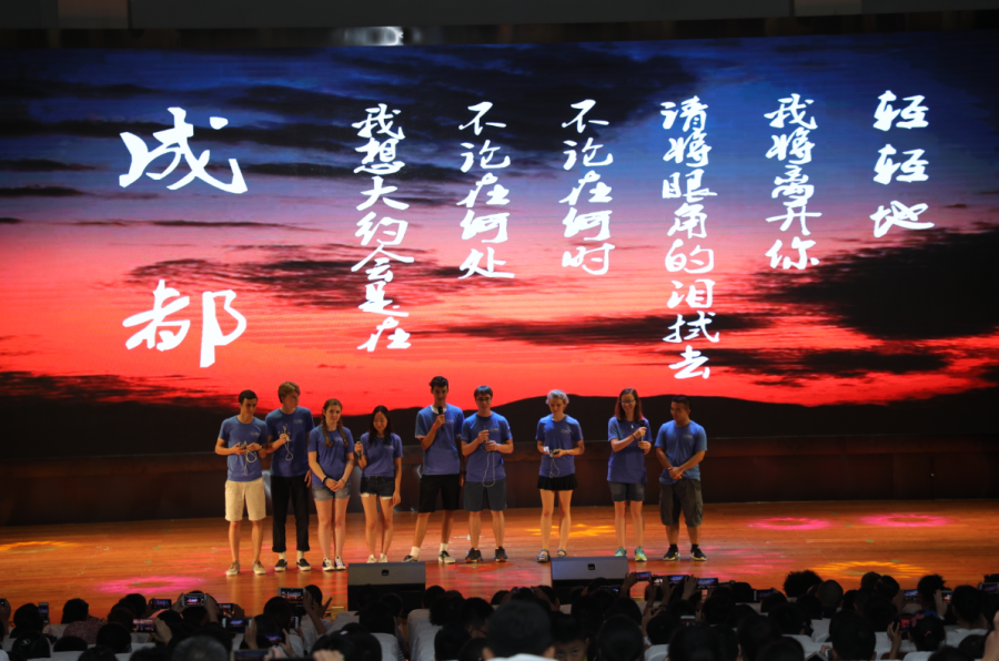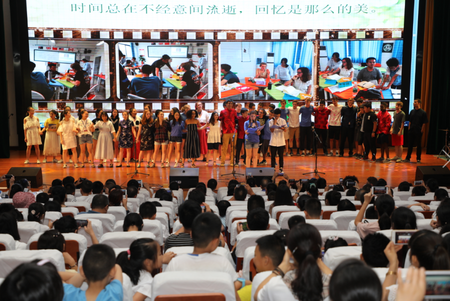 随后,29名美国学生为大家呈上了一台精彩纷呈、形式多样的汇报节目。朗诵和吟唱并用的《诵别离》让大家感受到了依依不舍的离别情;一场美国版的“三打白骨精”,爆笑全场;有才的美国学生还将古诗《蒹葭》演绎成歌曲,为大家带来了意想不到的惊喜。在着六周的学习中,美国学生不仅仅收获了知识,更体验了不同的中国传统文化,他们将这些收获转化成了一场极具四川特色的舞台秀。为表达对中国家庭、中国老师的不舍之情,美国学生还自编一曲《Stay》,希望一切美好在此刻停留。四川省川剧院的演员也来到现场助兴,一串串充满名族风味的演绎,一张张神奇的花脸,将川剧魅力呈现,引来美国学生一阵阵喝彩。