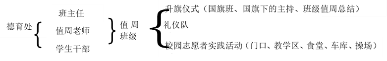 班级值周制度是实施健全人格教育的重要途径,它可以培养学生文明礼貌的礼仪意识、热情周到的服务意识、遵纪守规的规则意识、团结协作的集体意识;班级值周制度对我校职业体验体验、社会服务课题的有效补充;是展示班级形象、形成良好校风的重要窗口;也是学生自主管理、自我成长的重要形式。