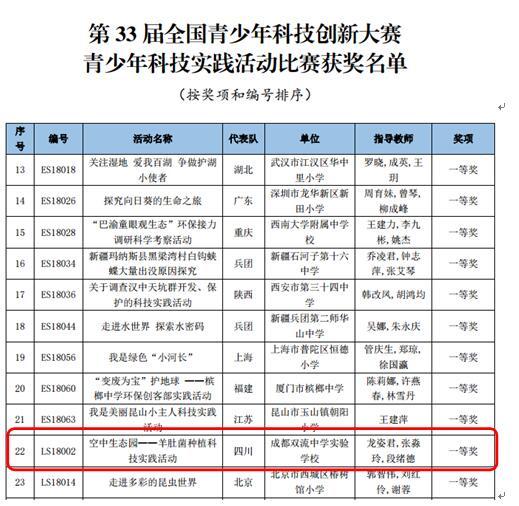 第33届全国青少年科技创新大赛评审已经结束,我校龙姿君、张淼玲和段绪德三位老师指导的《空中生态园——羊肚菌种植科技实践活动》是四川省推荐的13个项目中唯一一个被评为全国一等奖的。