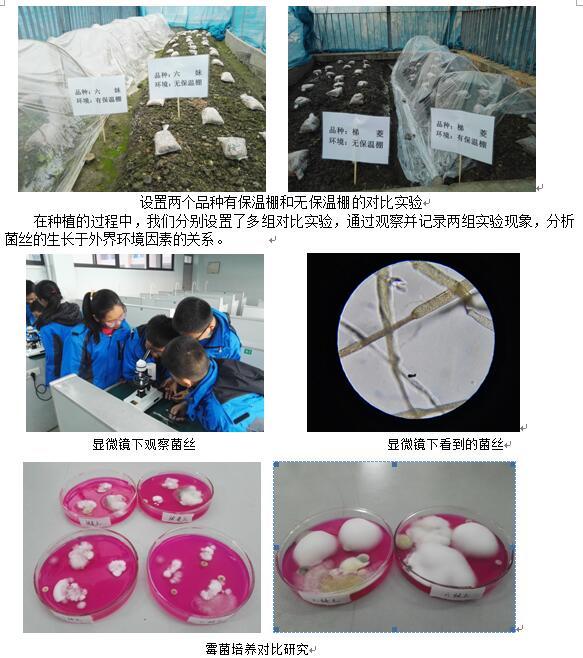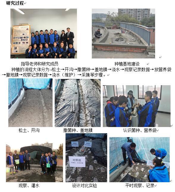 我校以课程改革为核心的素质教育为办学模式的引领下,大力开发综合实践活动课程已是十多年。2016年8月《基于核心素养培养的初中综合实践活动课程序列开发与常态实施研究》课题被列为全国教育科学“十三五”规划教育部重点课题。先后被评为成都市政府教学成果一等奖、四川省政府教学成果一等奖,全国教育教学成果奖二等奖。《空中生态园——羊肚菌种植科技实践活动》在学校综合实践活动课程大背景下应运开展起来,研究活动开展两年多来,学校坚持“以局部带动整体”的思路,在七八年级各班选拔组员,成立总课题组。总课题中的各子课题大都来源于参与体验羊肚菌种植中发现的问题,做到“小问题,真研究”,杜绝假大空。通过近两年的研究,我们也收获了不少的成果,形成了独特的研究产品,同时也证明了在屋顶、平台种植羊肚菌是可行的。代昊坤、廖宇嘉、彭浩、李浩、夏雪、陈智星等多位同学撰写的论文荣获第三十三届成都市科创大赛论文一等奖;同时代昊坤同学的小发明“羊肚菌采摘器”获中华人民共和国专利受理通知书。2018年1月,《空中生态园——羊肚菌种植科技实践活动》作为为成都市唯一一个科技实践活动被推荐参加第三十三届四川省青少年科技创新大赛,被评为四川省一等奖。