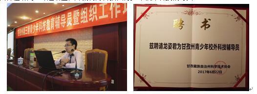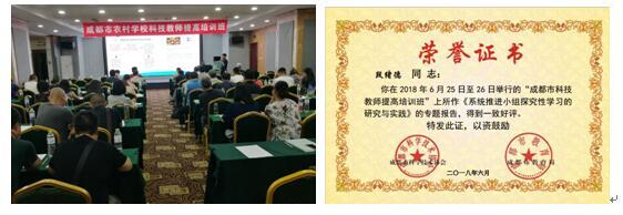 指导老师龙姿君作为四川省青少年活动中心“专家库成员”承担《空中生态园——羊肚菌种植研究》专题讲座,并被聘为甘孜州青少年校外科技辅导员。 指导老师张淼玲参加第十一届全国综合实践活动学术年会说课比赛,课题《初中小组研究性学习课程开发与实施——羊肚菌种植实践研究为例》荣获全国一等奖。因活动开展所产生的良好效果广泛传播,广东省第六期教育科研规划小课题研究(成都)高级研修班学习活动慕名来到我校,聆听龙姿君、张淼玲等老师的《研究性学习学生课题——羊肚菌种植实践研究》专题讲座。 2018年6月25-26日,在成都市青少年科技活动中心主办的成都市科技教师培训会上,段绪德老师应邀为大会做了题为《系统推进小组探究性学习的研究与实践》的专题讲座。 由于活动的扎实开展,得到了教育主管部门——双流区教育局研培中心生物教研员杜尚兵老师的认可,指导老师张淼玲受其邀请在全区初中生物教研会上做《初中生物小组研究性学习课题的开发与实施》专题讲座;指导老师龙姿君受邀在双流区高二生物教研会上做《空中生态园——羊肚菌种植实践研究课题》专题讲座。