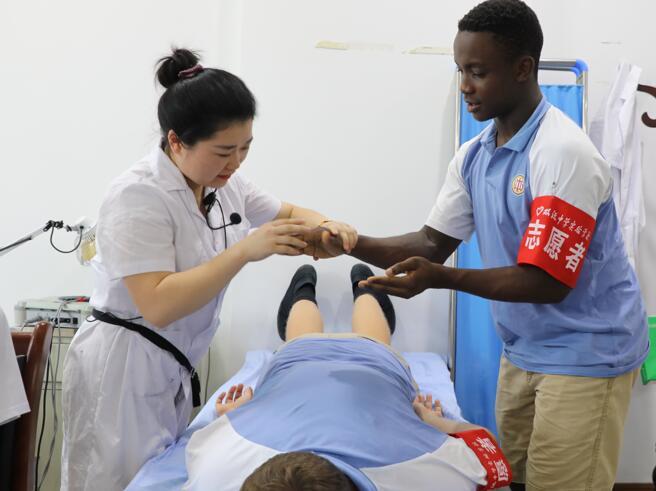 到达华孝颐养居后,其经理用英语向美国学生介绍了在此居住的老人情况,以及该敬老院的特点。随后美国学生来到推拿室学习推拿,在此由中医推拿医生讲解中医推拿的相关知识,如中医推拿的历史,推拿的作用等,教会学生认识肩颈背的重要穴位;然后中医推拿医生就推拿做简单讲解、实际操作;最后,学生在理疗推拿医生的指导下,两两学习,互相推拿。