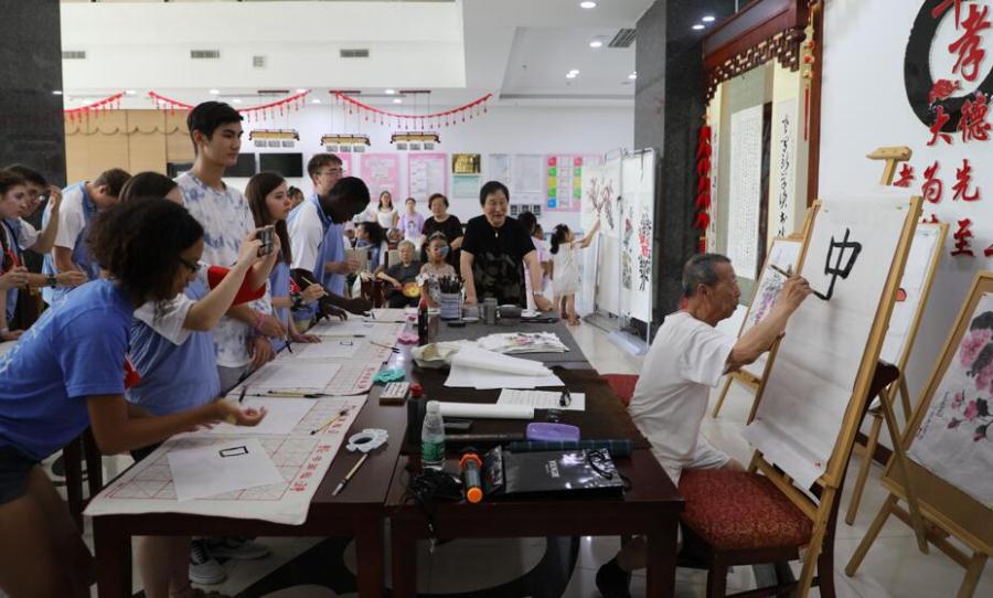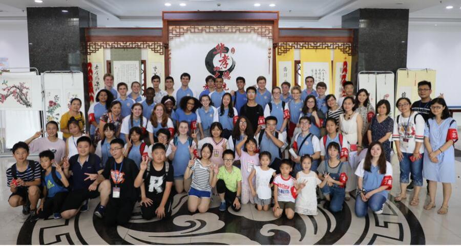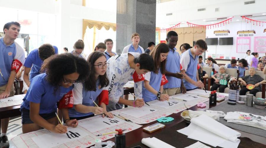 7月18日下午29名美国学生们,来到双流区华孝颐养居,进行社区服务活动。本次社区服务的内容分为三个部分:一、学习中医手部推拿;二、学习有关祝福老人的书法、国画并制作贺卡;三、与老人联欢。