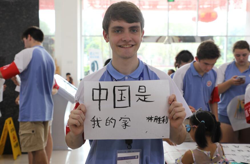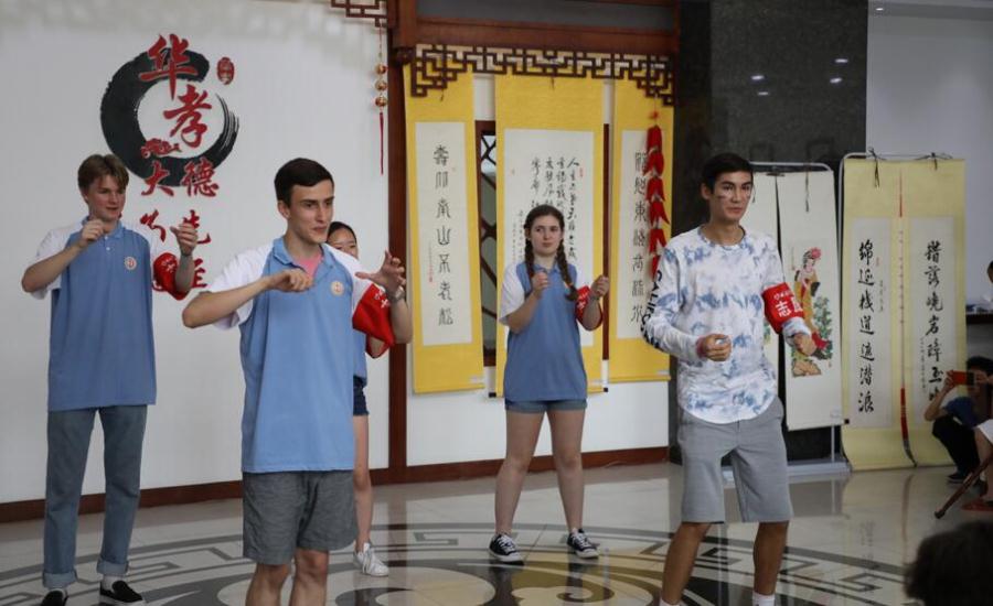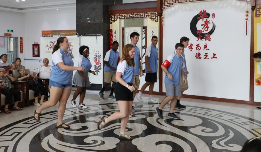 推拿学习结束后,由华孝颐养居的老爷爷和老奶奶展示、介绍他们的书画作品,并教美国学生们简单的书法,如祝福老人的话语(长寿、健康、平安等),以及简单的绘画,如梅、兰、竹、菊等。最后一个环节,三个班的美国学生们分别为老爷爷、老奶奶们送上了自己编排的形式各异的节目,有个性十足的舞蹈,饱含神情的歌曲,还有轻松诙谐的情景表演。美国学生张显个性的表演,犹如炎炎夏日注入的一股清流,给老人们带来了无尽的欢乐与笑语。老人们也不甘落后地献身了他们精心编排的节目,有着中国特色的民族舞,还有高亢的民歌,最后,美国学生们都被一位老人嘹亮的歌声震撼到纷纷起身鼓掌。整个场面热闹而温馨,完全没有异国的违和感。