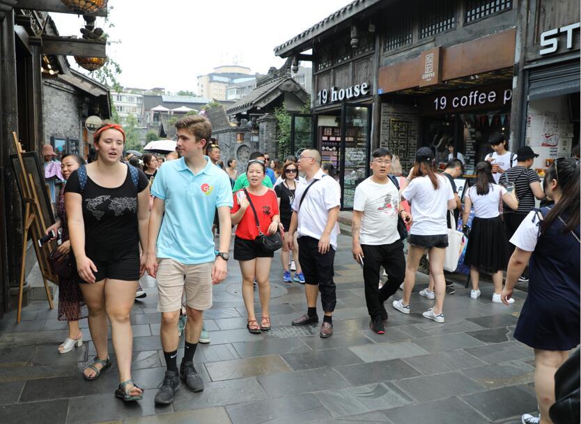看完憨态可掬的熊猫后,我们又驱车来到成都市三大历史文化保护区之一的“宽窄巷子”。 宽窄巷子位于四川省成都市青羊区长顺街附近,由宽巷子、窄巷子、井巷子平行排列组成,全为青黛砖瓦的仿古四合院落,这里也是成都遗留下来的较成规模的清朝古街道。这里有各种成都美食,各式带有地方文化特色的纪念品,带有老成都味道的茶室等等,都让美国学生们流连忘返。他们奔走于各条小街小巷之间,尽享美食与美景。并且,在这里还赶上了一场太阳雨,此情此景更是终身难忘吧!