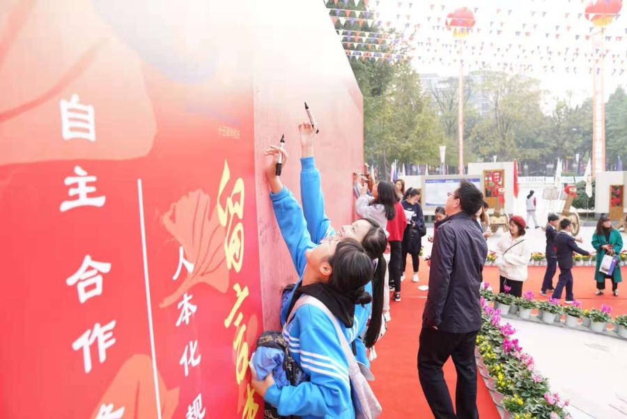 10:38,高志文校长教育专著《以课程改革为核心的素质教育》发布会在庆典上举行。全国综合实践活动委员会荣誉理事长、首都师范大学陈树杰教授在发布会上介绍了高志文校长的主要经历、教育成就、教育思想和教育愿景,并为高校新书发布会揭幕。双流中学徐天福校长作为双流区高志文名校长工作室学员在发布会上发言。发布会最后,高志文校长现场为新书签名并现场赠书。