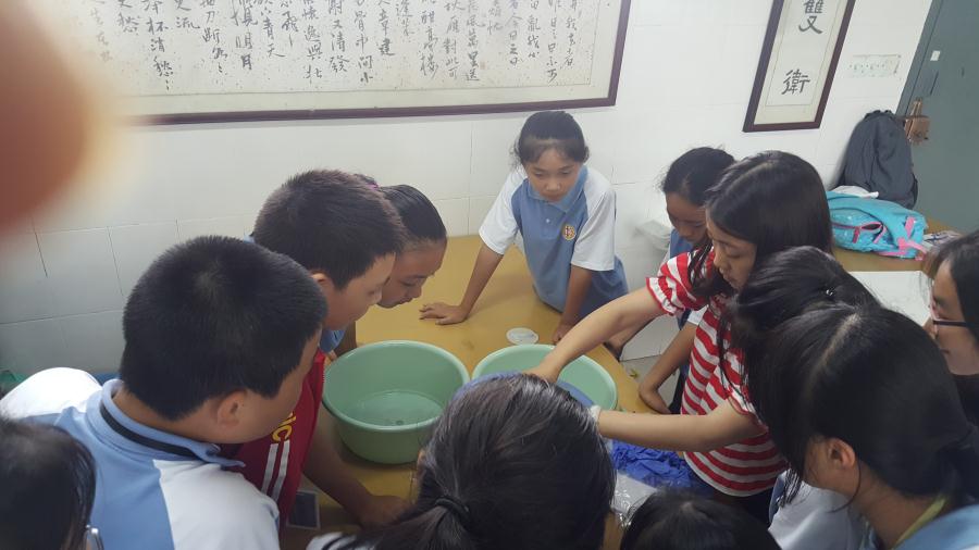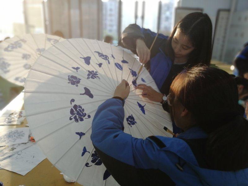 同学们议定以扎染、剪纸、青花三种技法来表现“传统文化”;选用橙、蓝两大色调来呈现学校长达15年的沉淀,展望学校未来的辉煌。最后舞台上向大家展示的20套服装和20件手工艺品是“创意美术”选修课的部分成果。
