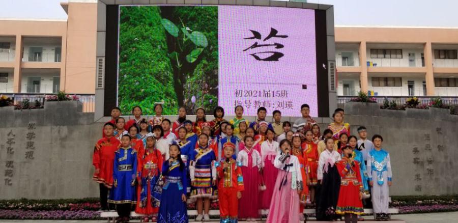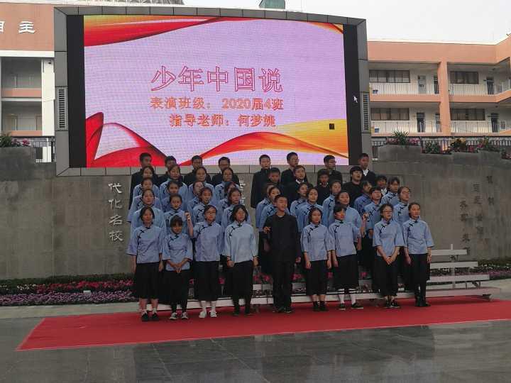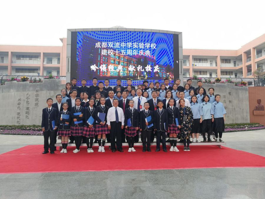 最后八年级四班同学们将朗诵和演唱结合,带来表演《少年中国说》。同学们歌声飞扬,一展中国少年的意气昂扬。下午4点10分,成都双流中学实验学校15周年校庆活动“吟诵经典、献礼校庆”圆满结束!高校长和各部门领导们上台和课题组老师们、表演者们共同合影,定格下了这美好的画面。 (程继红)